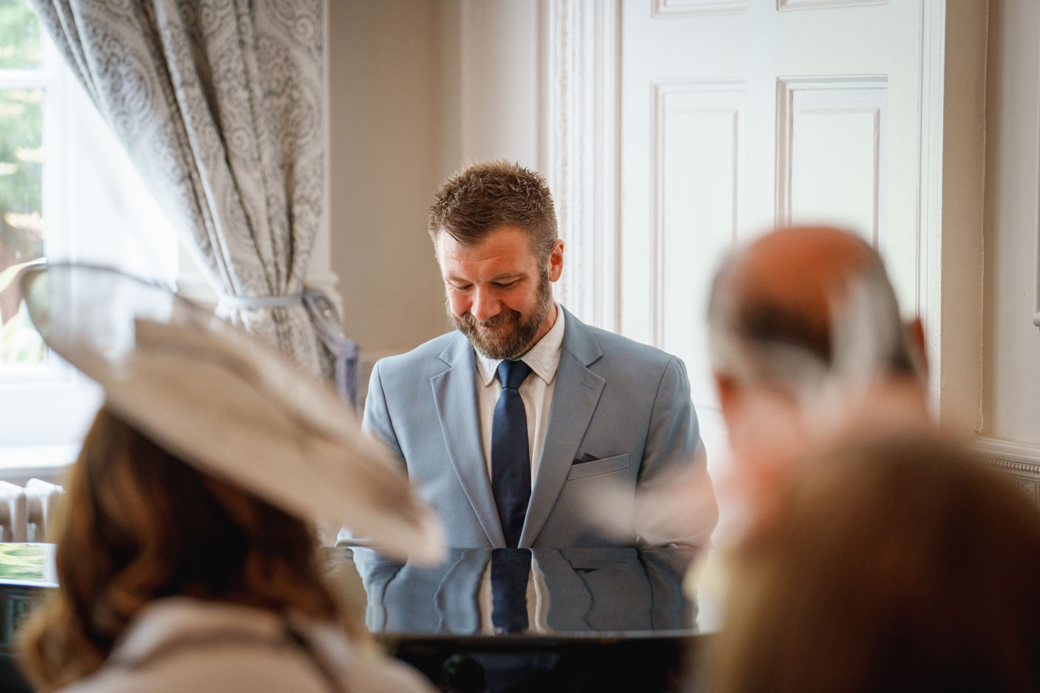 Transitioning smoothly from preparations, the indoor ceremony in one of Bawtry Hall’s elegant rooms was stunning. Soft natural light flooded through the tall windows, creating a dream lighting for a wedding photographer in Doncaster. Rachel’s entry brought emotional gasps, while Joel waited, his anticipation building. Exchanging vows, they mixed laughter and heartfelt moments beautifully. All watched on by Rachel’s two rescue dogs.